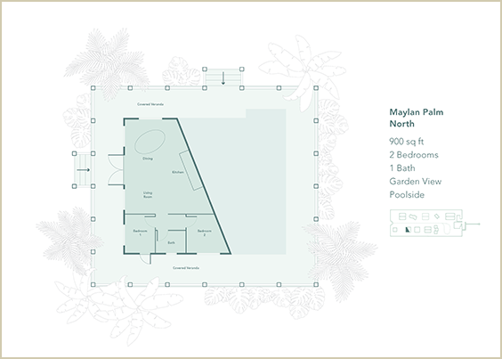 The Malayan Palm has the option of opening a locked interior door, combining the space into a 3 bedroom, 2 bath home.